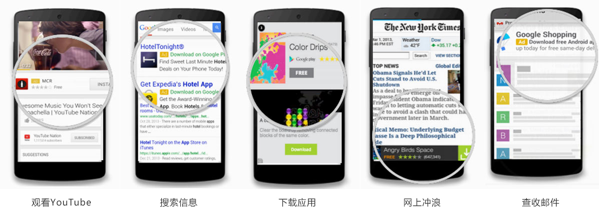 覆盖智能手机和非智能手机用户,可在Google AdMob广告联盟各个移动和应用程序及设备上面投放。