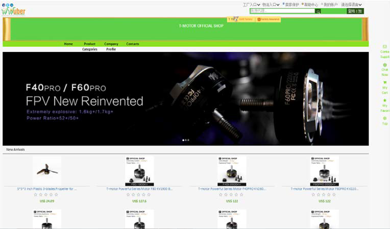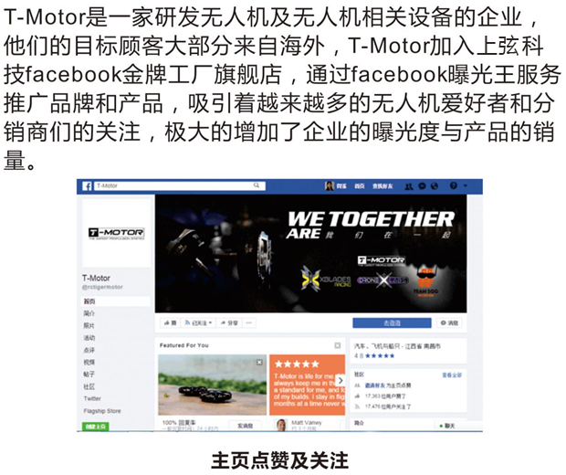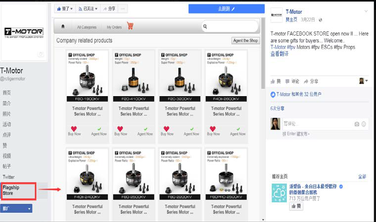 首先在拥有24亿用户的Facebook企业主页上建立Facebook工厂旗舰店,展示T-motor的各规格产品商品,通过资质审核获得全球工厂认证。需要购买的客户分别通过BuyNow和AgentNow进行购买和分销;