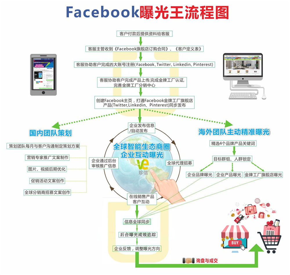 1、一站式专业服务:帮助企业建立专业、有条理、有活跃度的Facebook企业专页,在Facebook上创建集展示、分享、销售、分销于一体的工厂旗舰店,实现企业客户一站式购买分销,避免跳转流失客户,是客户到订单转化的方式,解决企业销售难题。