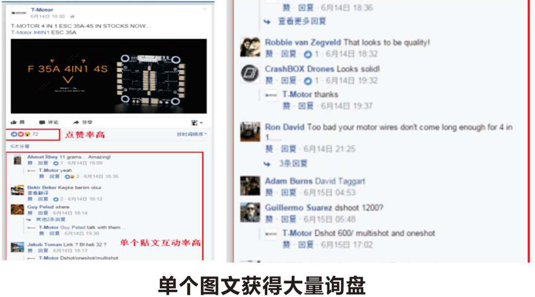 高级策划顾问与T-motor沟通公司的品牌和产品定位,精选四个品牌产品关键词;结合Facebook等社交媒体对用户及用户人群的定位,选取符合关键词定位的上中游用户群推广T-motor,向真正对T-motor的产品感兴趣的意向客户或关联客户精准曝光T-motor的品牌、产品及工厂旗舰店。